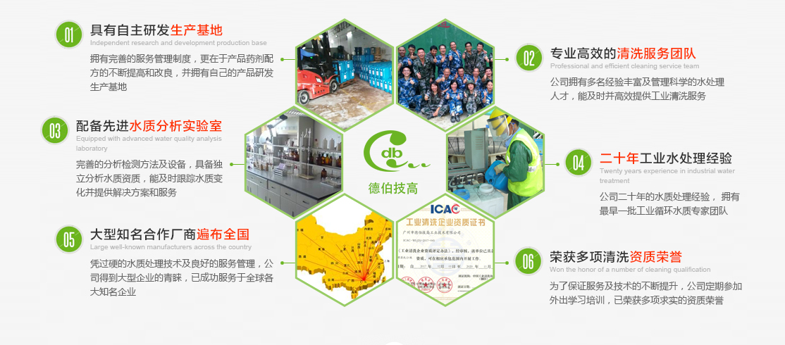具有自主研發的生產基地,專業高效的清洗團隊,配備先進的水質分析實驗室,二十年工業水處理經驗,大型知名合作廠商遍布全國,榮獲多項清洗資質榮譽